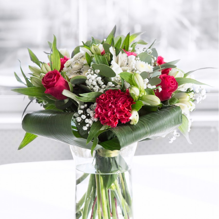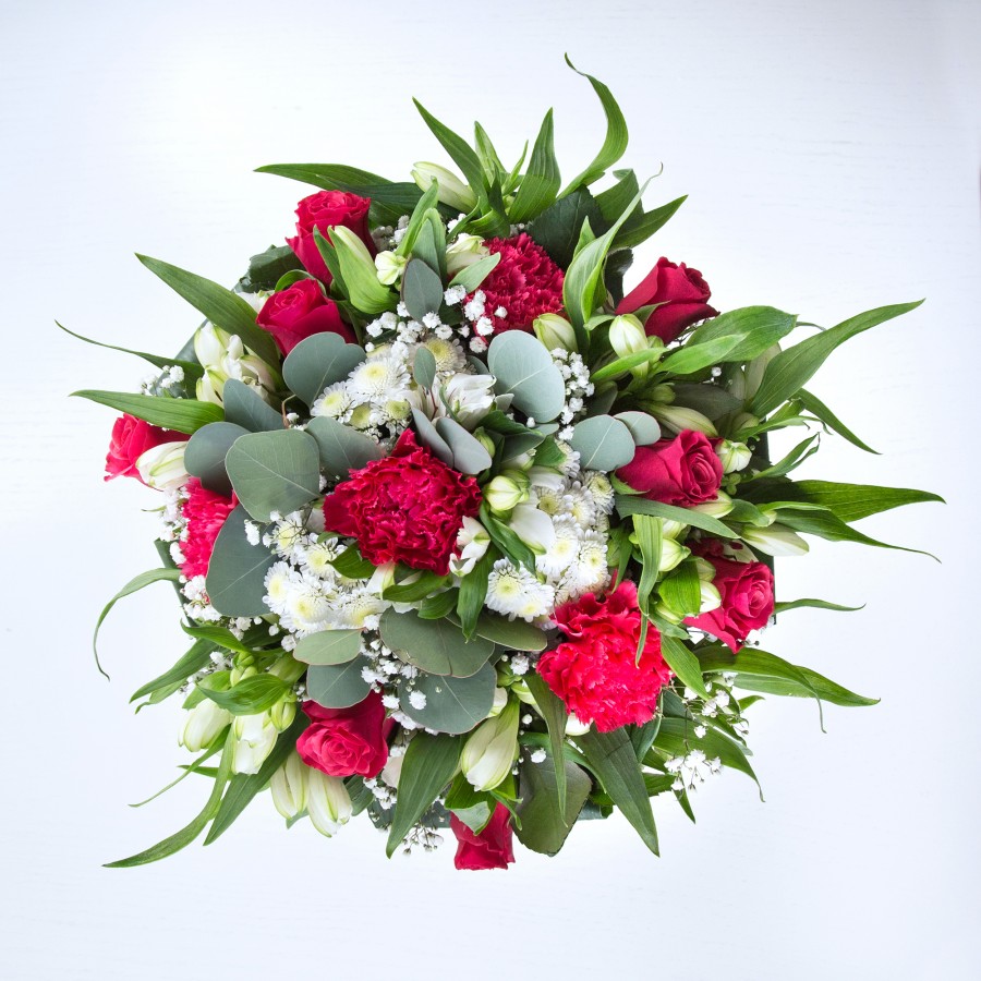 Discover the exquisite beauty of our unique bouquet, thoughtfully designed to captivate your senses. This arrangement features luxurious red roses and vibrant carnations, harmoniously paired with sweet white chrysanthemums and delicate gypsophila.