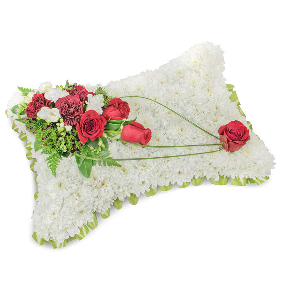 Show empathy and respect with our Memorial Elegance Floral Arrangement, an exquisite expression of condolence. This bouquet is composed of a harmonious mix of white chrysanthemums, red roses, white freesias, dark red carnations, dianthus, and bear grass. Every flower is hand-picked, ensuring that each bloom radiates freshness and beauty.